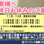 2025年9月26日 / 最終更新日 : 2025年10月17日 サンランド船橋 施設利用情報 終日お休みのご案内【11月・12月】 皆様には大変ご迷惑をお掛け致しますが、ご理解・ご協力の程、お願い申し上げます。