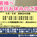 2026年3月16日 / 最終更新日 : 2026年4月1日 サンランド船橋 施設利用情報 終日お休みのご案内【5月・6月】 皆様には大変ご迷惑をお掛け致しますが、ご理解・ご協力の程、お願い申し上げます。