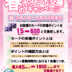 2025年12月15日 / 最終更新日 : 2026年1月25日 サンランド船橋 イベント情報 春のポイント交換キャンペーン 上記の期間中はポイント交換キャンペーンを実施しております♪ フロントにて来場ポイント15ポイントを600プレミアムと交換致しますのでこの機会に是非ご利用下さいませ。 ※なお、天候などにより営業中止になった場合や無人営業時 […]